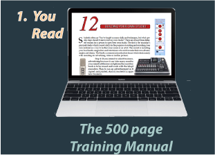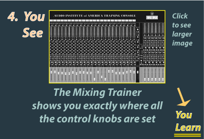 You also refer to your Mixing Trainer Window. All the control knobs and switches are set in the exact positions to show the sounds you are hearing. When the video or audio is finished, you return to your training manual and continue reading until you reach the next "flagstop." What could be easier?